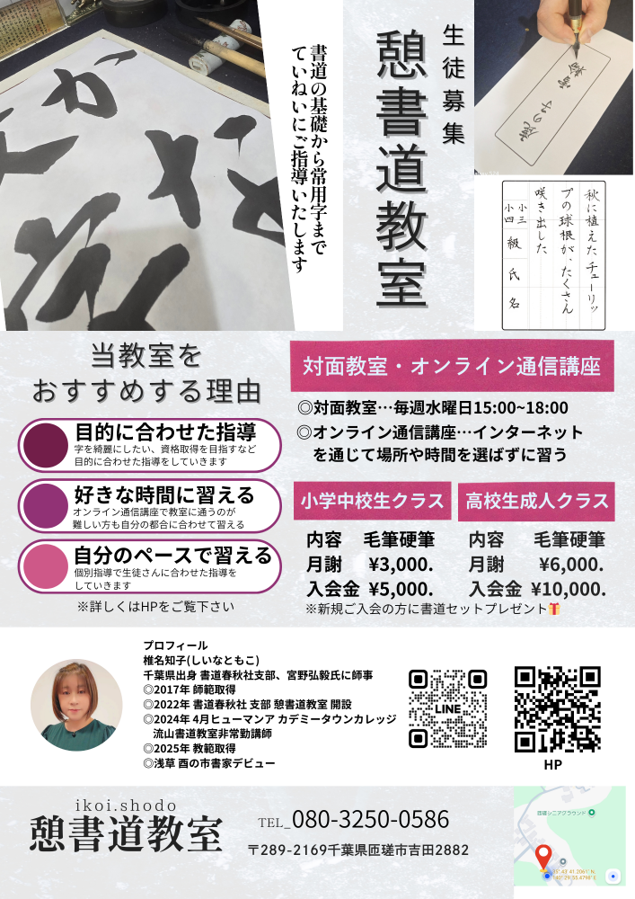 | 対面教室 | 毎週水曜日15:00~17:00 書道セット貸出し可 場所:千葉県匝瑳市 |